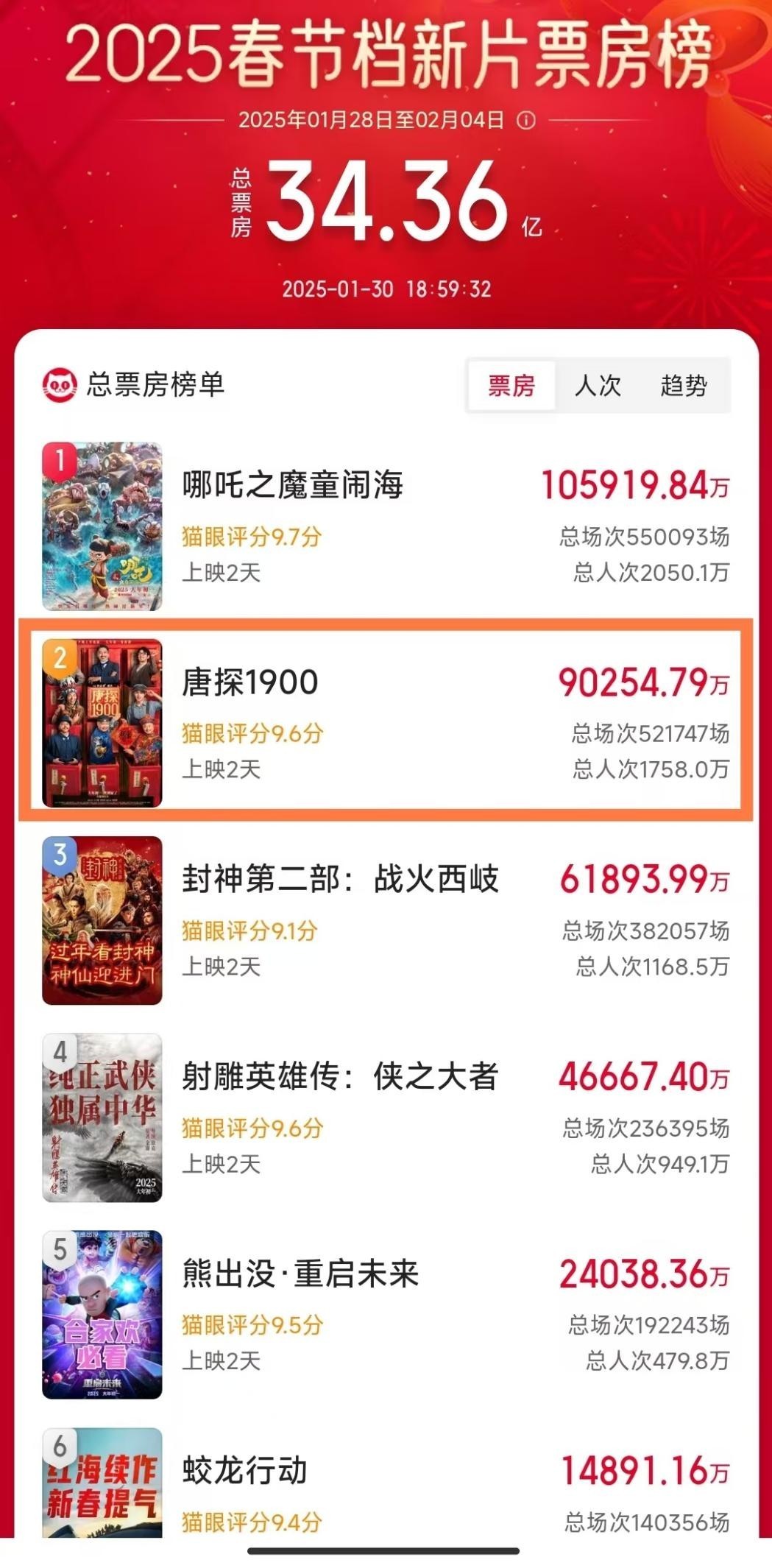 2025年春节档第二天,电影票房竞争强烈,总票房冲突30亿欧洲杯体育,其中《唐探1900》的票房达9亿,排名第二。