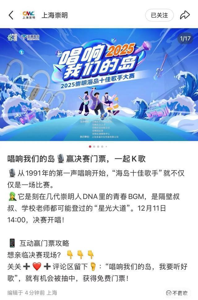 本年,大赛非常在启隆镇树立海选点,邻里们纷纷饱读舞她参赛:“你的歌声这样动听,得让更多东说念主听到,也给我们启隆争气!”顾庆芳欢然答允。海选舞台上,她颠倒选唱《大丛林的清晨》:“我千里醉于启隆的绿意,也常去崇明游玩,两地的生态好意思景让我山外有山,这首歌正好能抒发我对这方水土的喜爱。”凭借苍劲实力,顾庆芳一举拿下海选第一,并一齐过五关斩六将闯进百强、置身16强。 顾庆芳认为,这场比赛不仅让她有了展示自我的舞台,展现了银发一族的风仪,还搭建了启隆镇与崇明的调换平台,让两地以歌声为纽带,把毗邻的友谊牢牢贯串,也让这份情缘越发深厚。”如今,顾庆芳仍逐日坚抓老练,只为在总决赛舞台上,用最诚实的歌声回馈我方的怜爱,以及这份合并两地的因缘与支撑。 12月11日 2025崇明海岛十佳歌手大赛总决赛 行将在区融媒体中心演播厅燃情开唱 让我们预祝通盘怀揣音乐怜爱的选手 在巅峰舞台怒放光彩 共同见证海岛十佳歌手及三甲荣耀出身 福利时刻 登录“上海崇明”App、“上海崇明”小红书,参与互动,即有契机赢取“海岛十佳歌手”精彩门票!