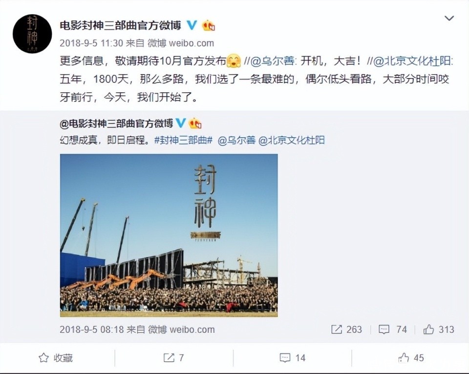早在2014年,乌尔善就运转构念念《封神三部曲》,过程长达4年的谈判,2018年9月5日崇敬在青岛东方影皆开机,其时制片东说念主杜杨说“五年,1800天,那么多路,咱们选了一条最难的,偶尔折腰看路,大部分时候咬牙前行,今天,咱们运转了。”这意味着从一运转,就笃定了三部曲将由北京文化主投,开拍前就还是谈判了五年的时候。