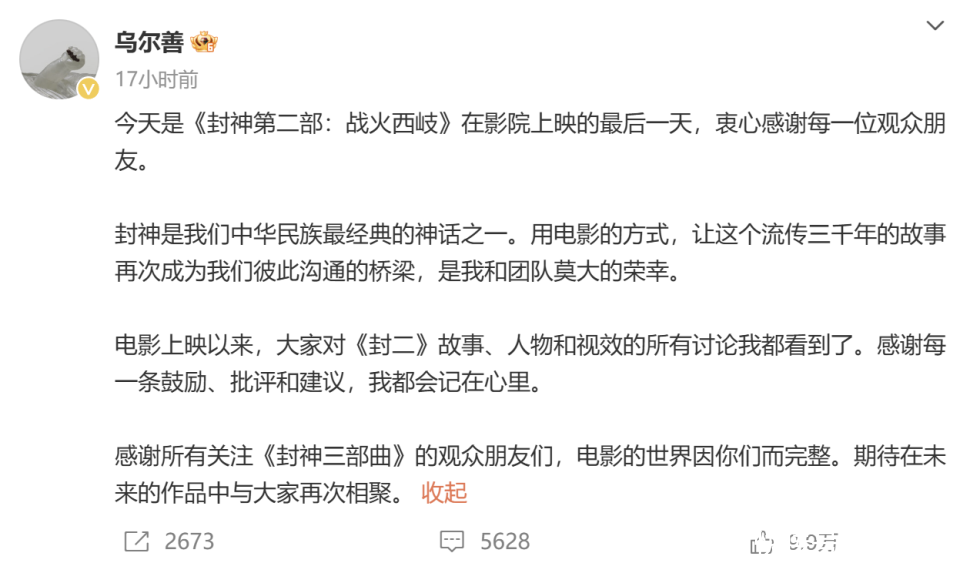 今天是《封神第二部:战火西岐》在影院上映的终末一天,由衷感谢每一位不雅众一又友。