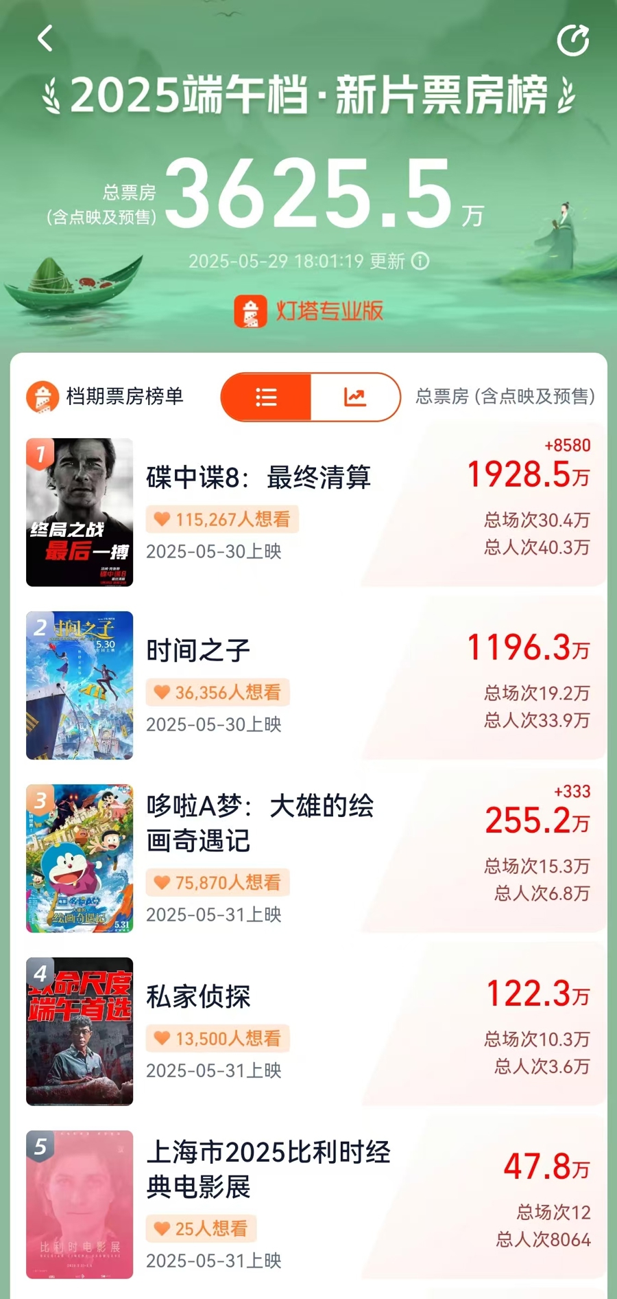 据灯塔专科版,本年端午档(5月30日至6月2日)有十余部影片上映,罢休5月29日18时,端午档总票房(含点映及预售)3625.5万元,预售排行前三的电影分别是《碟中谍8:最终计帐》《时间之子》《哆啦A梦:大雄的绘制奇遇记》。