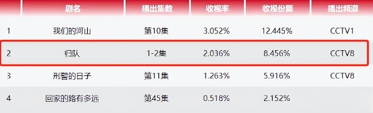 《归队》已经播出就收视飘红,开播收视破2,仅次于央一热播的《咱们的邦畿》。