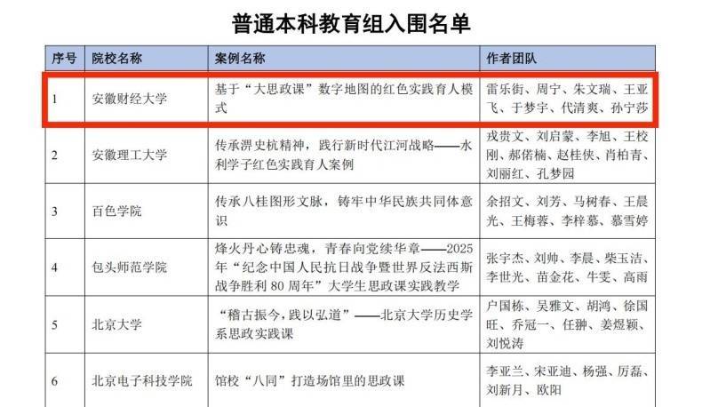 近日,2026年宇宙高校“大想政课”践诺熏陶典型案例搜集算作戒指肃肃揭晓,入围案例292件,安徽财经大学马克想目标学院申报的《基于“大想政课”数字舆图的红色践诺育东说念主模式》告捷入选。