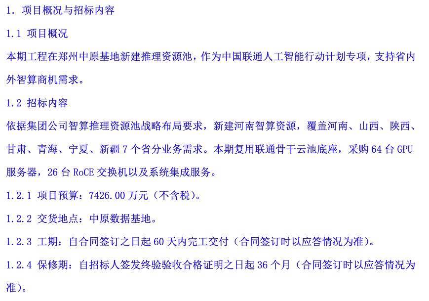 本期复用联通主干云池底座,采购64台GPU做事器、26台RoCE交换机以及系统集成做事。
