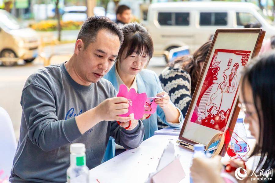 市民在户外雅会区体验剪纸。东说念主民网摄